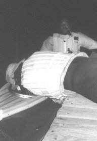 At this point, Captain Al and John actually did the impossible. With super human strength, they turned their craft around and began fighting against the tremendous ebb tide which was now being augmented by a twenty five knot wind. The sting of salt water welled in their eyes as waves crashed over their hull. After about fifteen minutes of full speed ahead, breakneck, frantic paddling, with wave after wave crashing over their bow and heads, John attempted to wipe the salt from his eyes with the arm of his drenched paddling jacket. But just as he regained partial vision, he heard Al yell, “Watch out . . .BOAT . . . BOAT!”